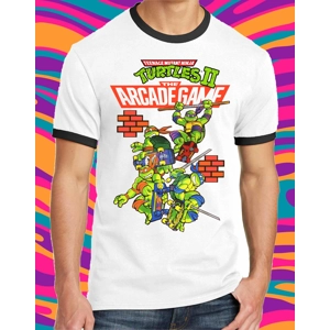 This shirt features the art from Turtles 2 The Arcade game. Nice. It comes on a plain white Gildan softstyle brand or a white/black ringer shirt for a little more.